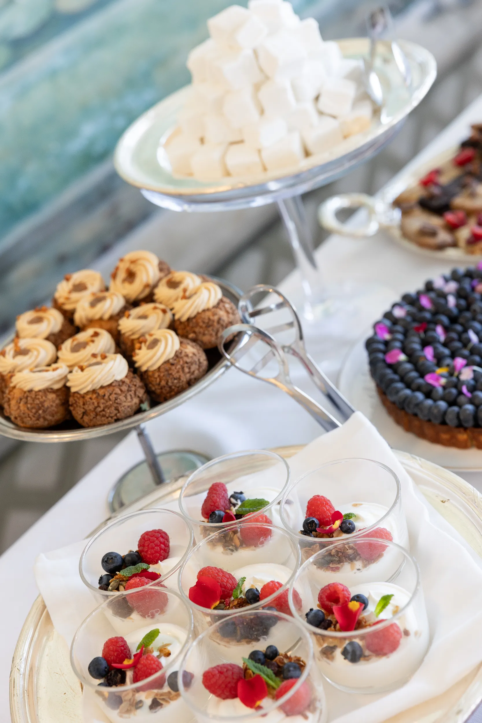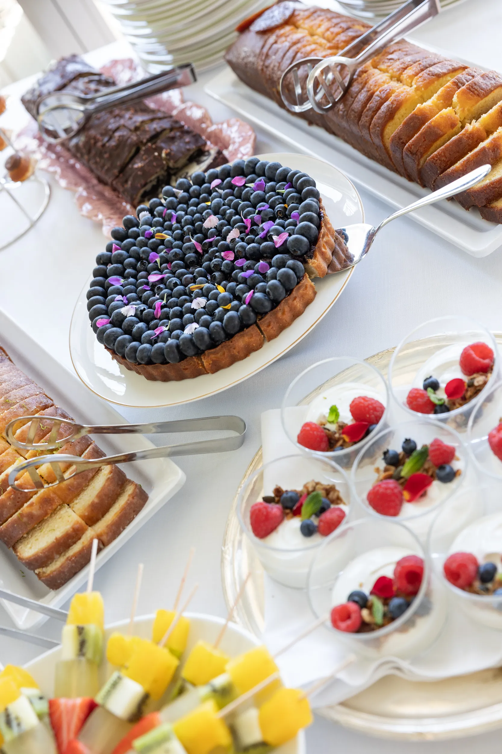 Bufet de postres: Una temptadora selecció de formatges internacionals, pastís de maduixes, plum-cakes de llimona, iogurt amb fruits vermells, galetes i broquetes de fruita.