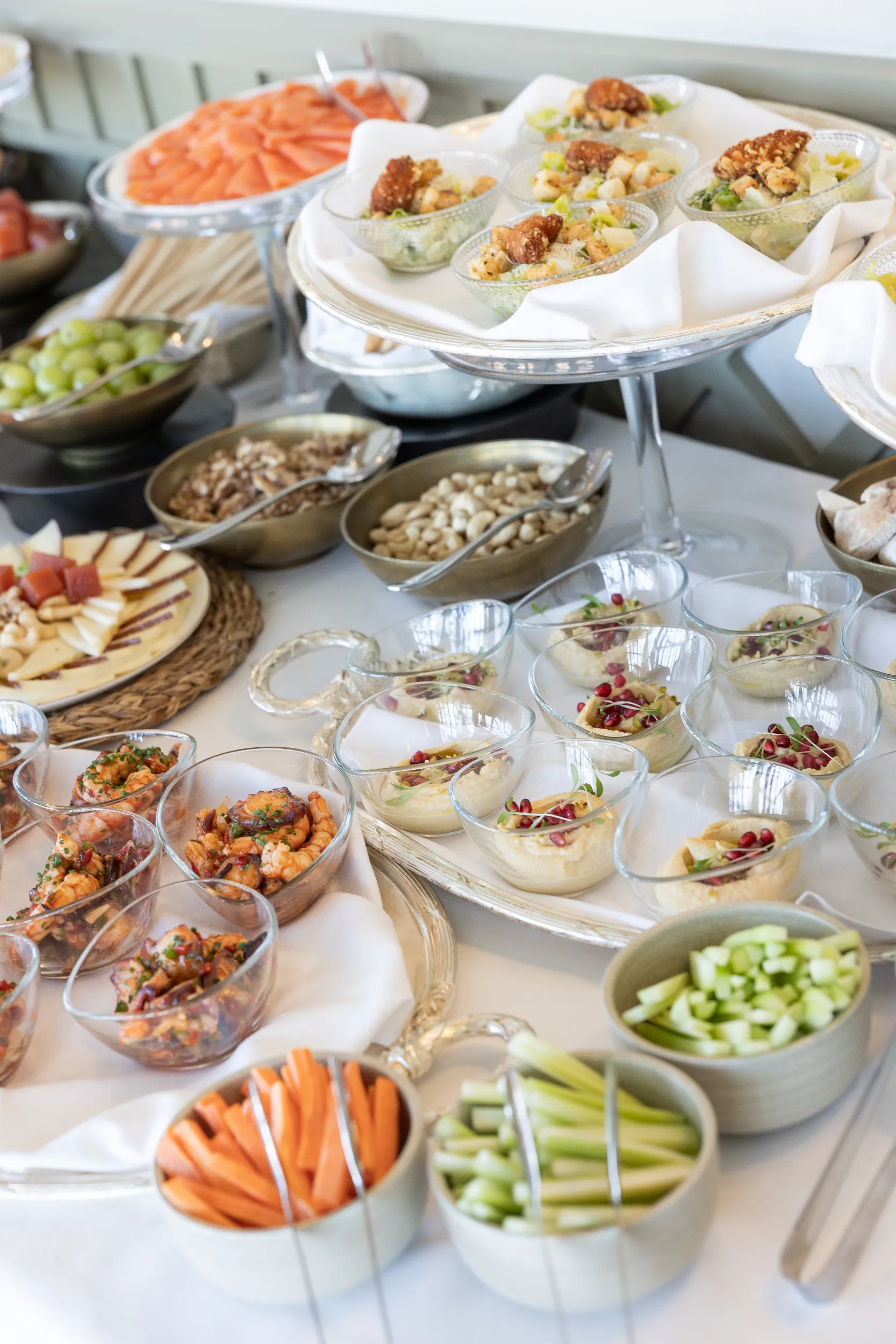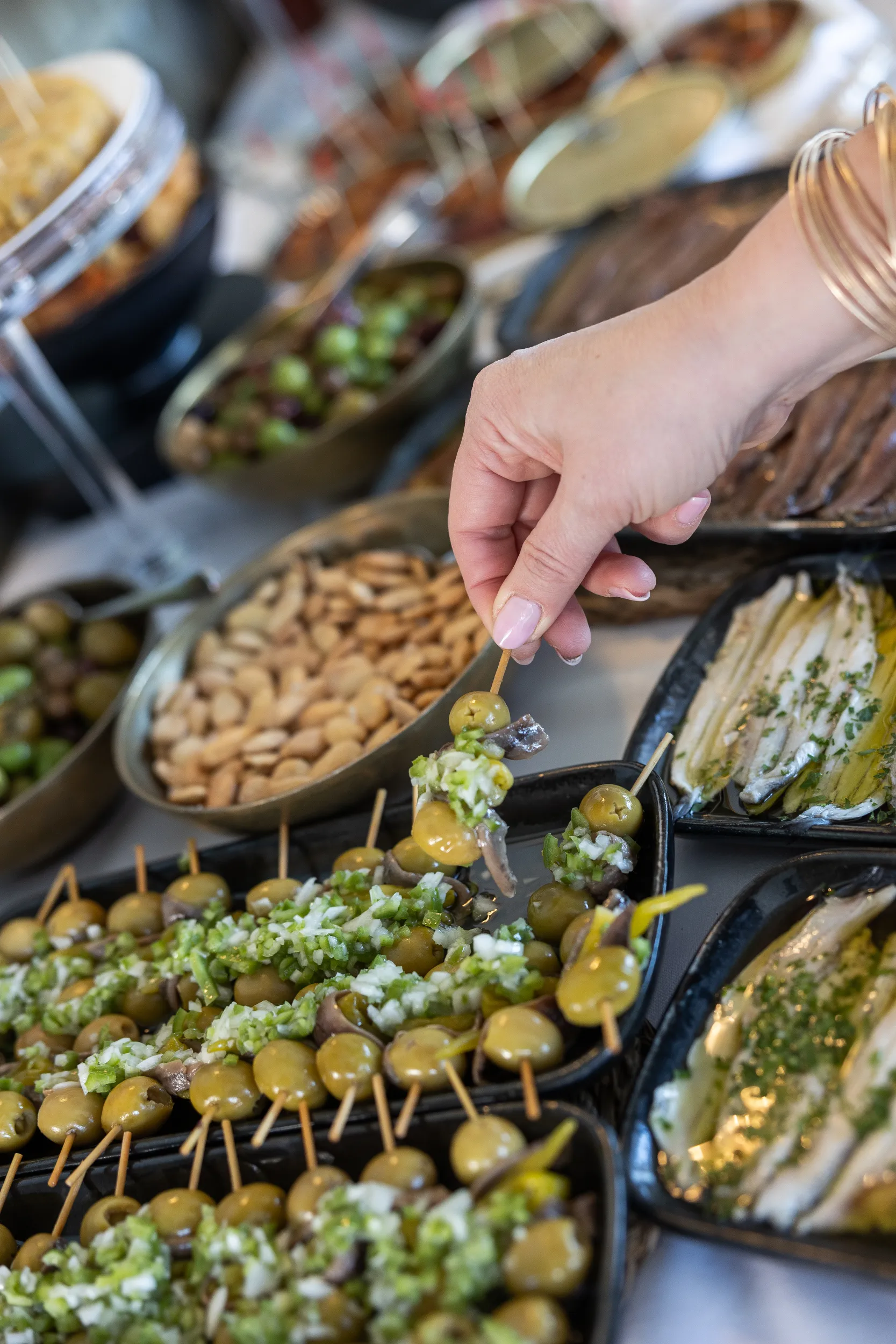 Plats freds i aperitius: Una acurada selecció que inclou salpicó de pop, amanida Niçoise, mini amanida Cèsar i hummus amb crudités. L’estació d’aperitius ofereix gildes, anxoves, seitons i una varietat d’olives, acompanyades de pans ecològics.