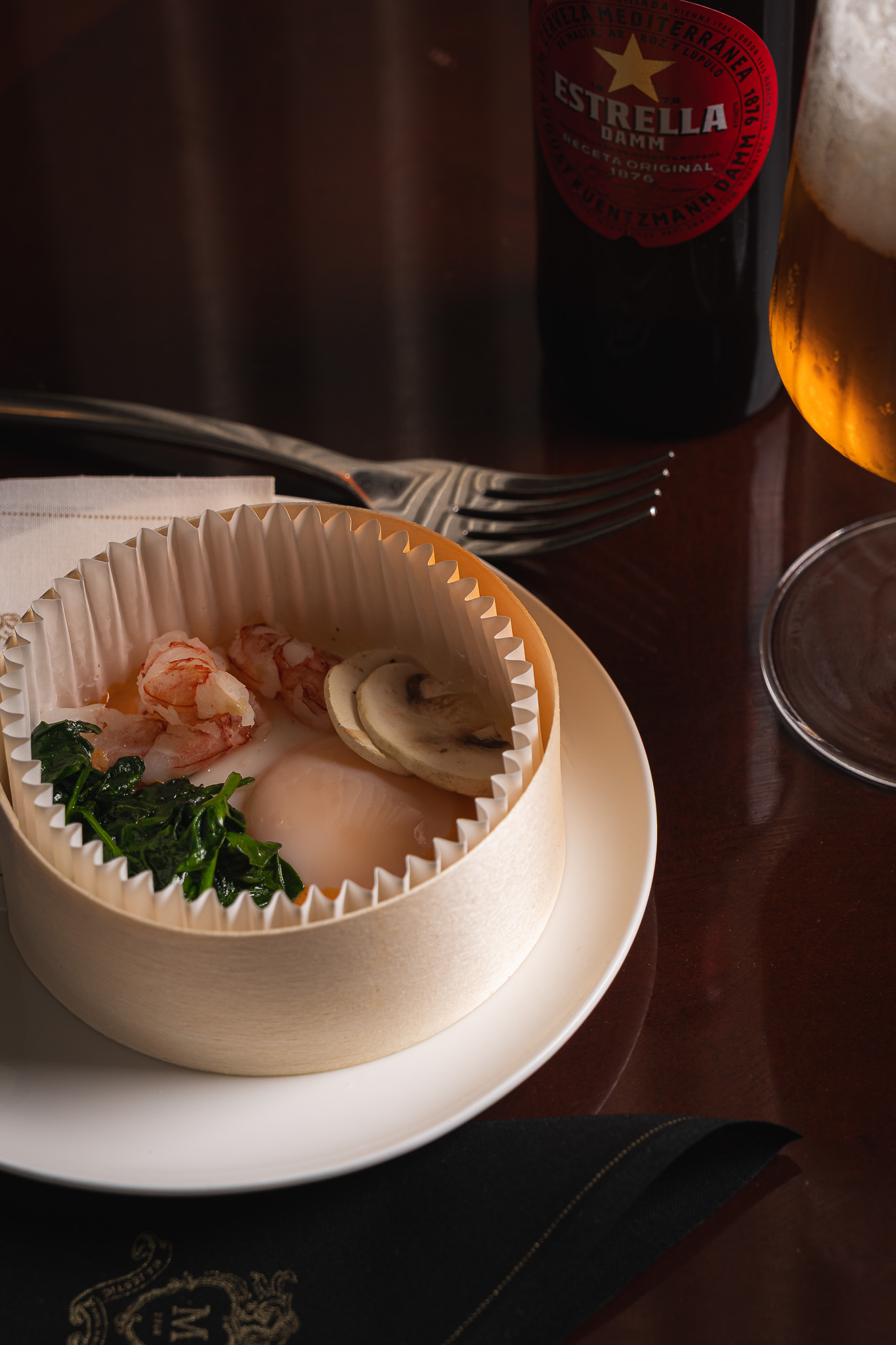 Platillo (10 €): Royal de gambot, espinacs i bolet de París.