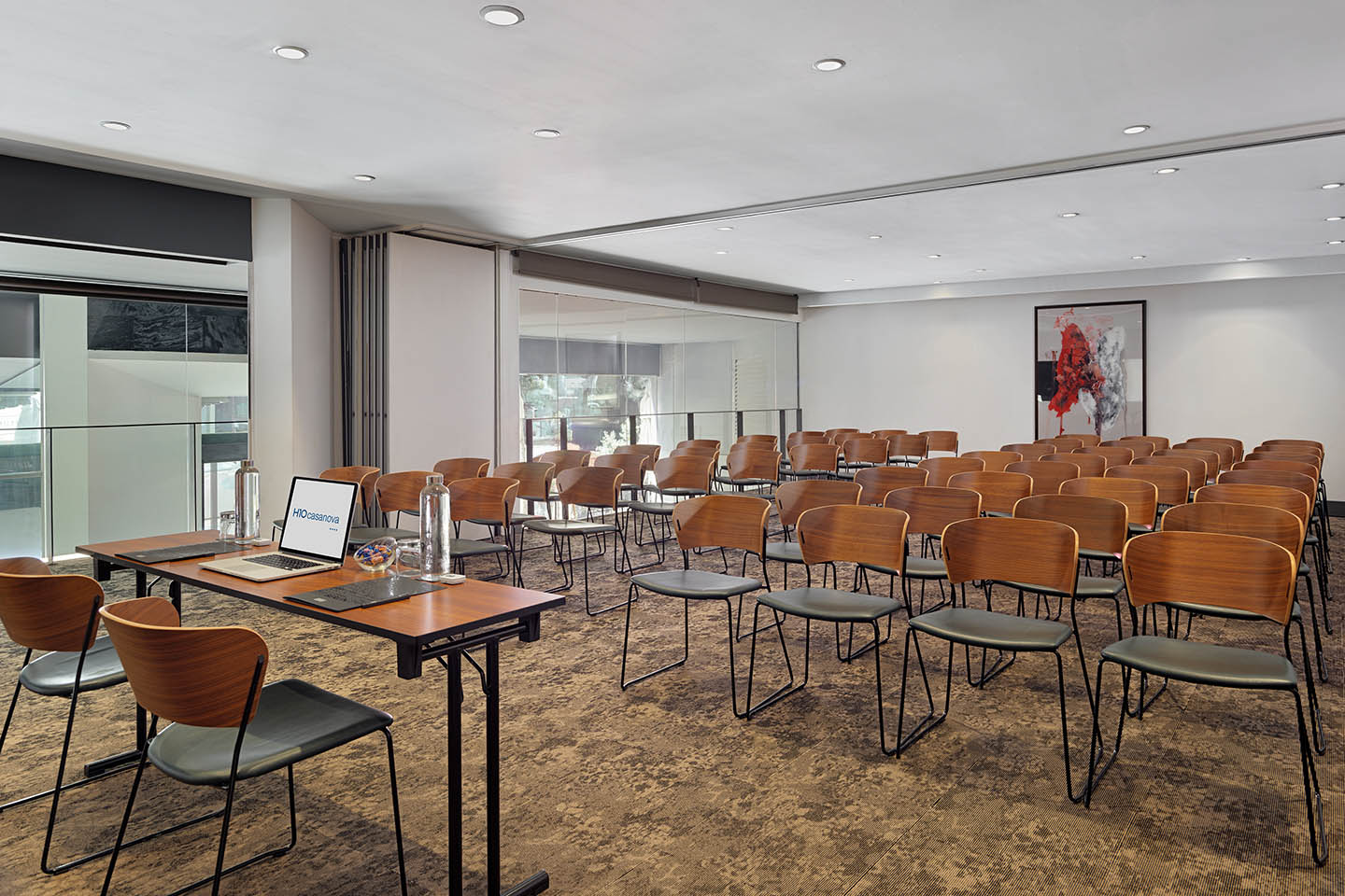 - Sala Meifren (48 m²): Un espai tecnològicament avançat que inclou un projector d’última generació i un sistema de so d’alta fidelitat (inclòs en la reserva). Amb una capacitat de fins a 30 persones en format teatre , és el lloc perfecte per a presentacions d’impacte.