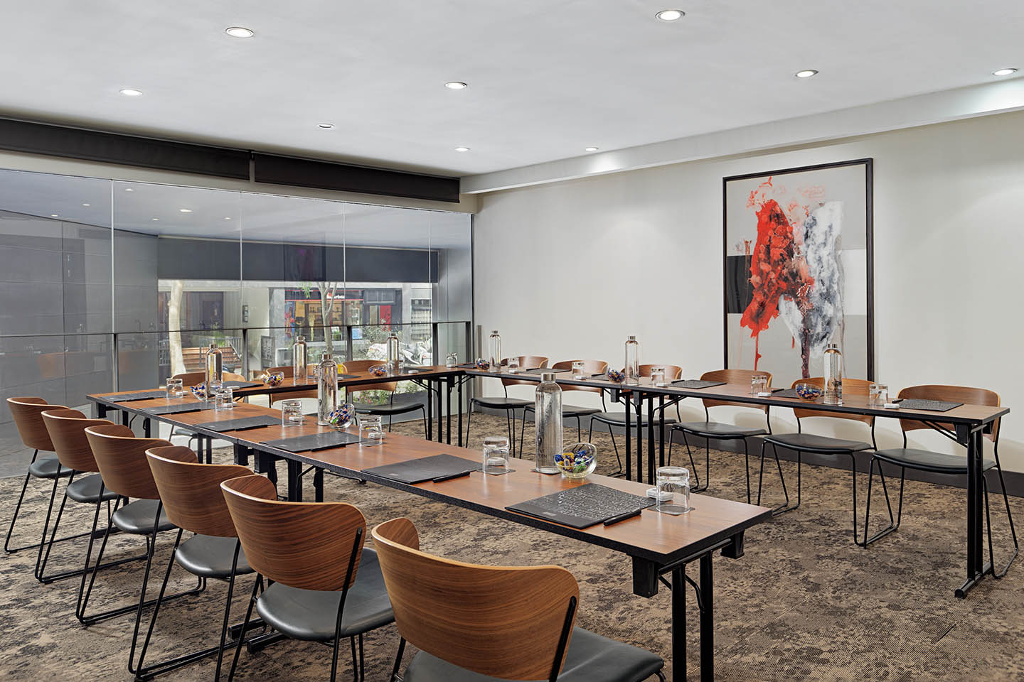 - Sala Mir (38 m²): Destaca pel seu gran finestral que inunda l’estança de llum natural, creant una atmosfera càlida i productiva. Amb una capacitat de fins a 28 persones en format teatre , és el lloc perfecte pels teus esdeveniments corporatius