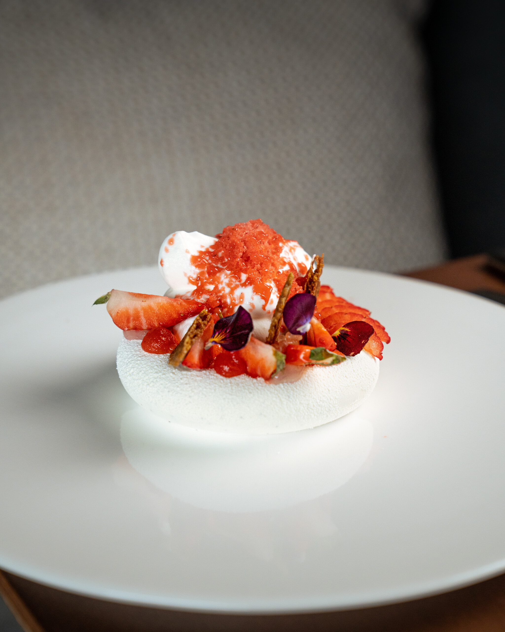 Maduixes amb nata, hibisc i ruibarbre.