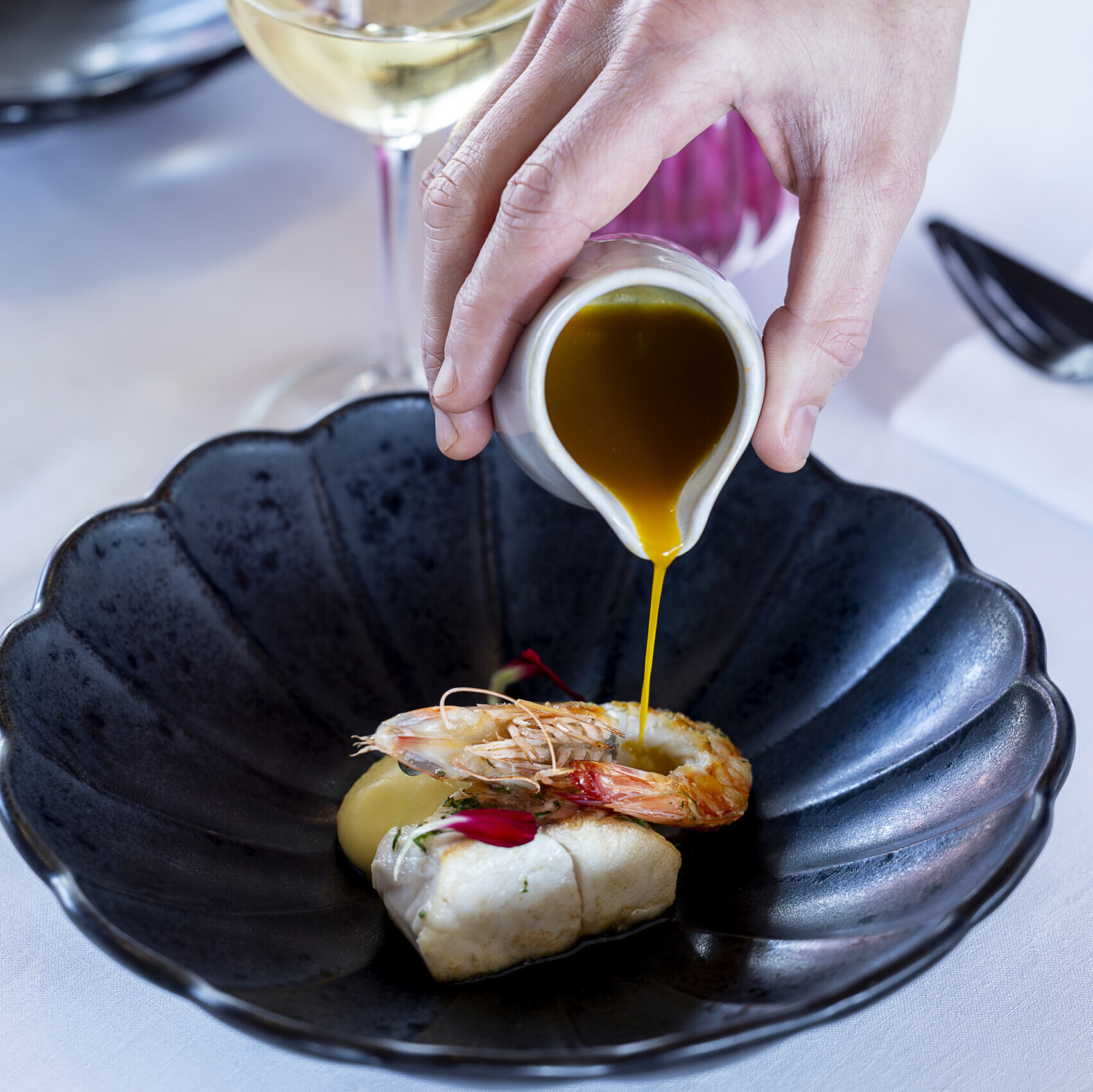 Suquet de peix i llagostí amb safrà i cremós de patata